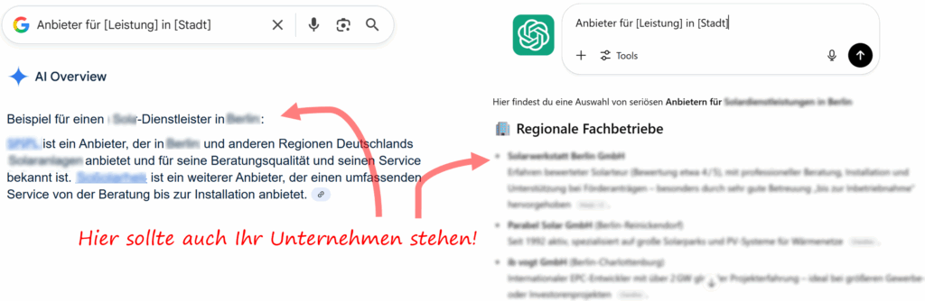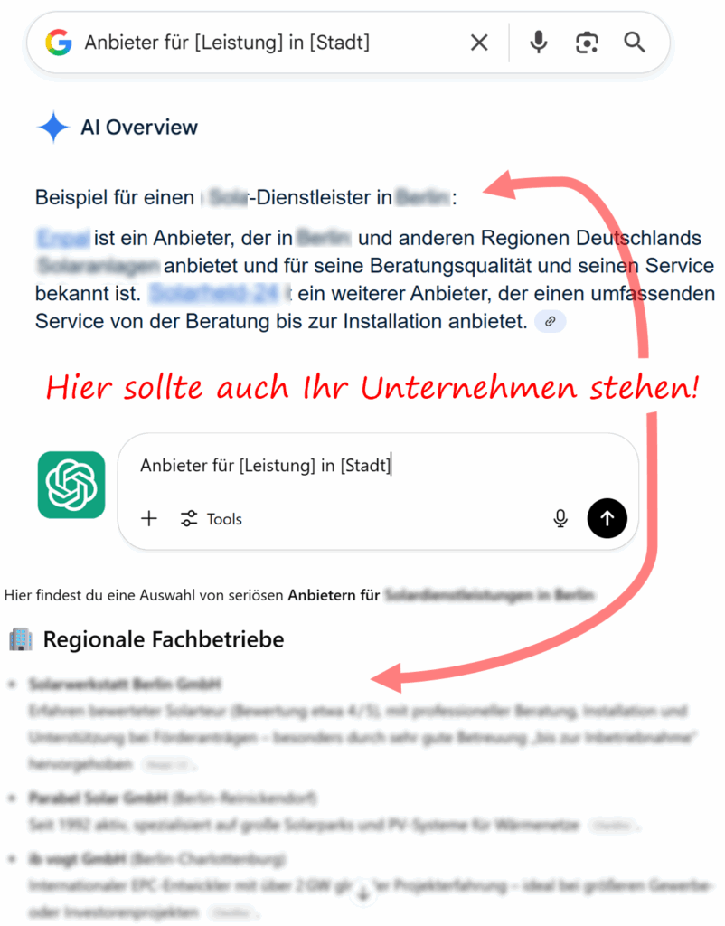 KI-Sichtbarkeit bedeutet, dass Ihr Unternehmen in den Antworten von ChatGPT, Copilot, Gemini und anderen KI-Assistenten erwähnt wird. Da immer mehr Menschen KI-Tools für Recherchen nutzen, ist es entscheidend, dort präsent zu sein, wo Ihre Kunden suchen.